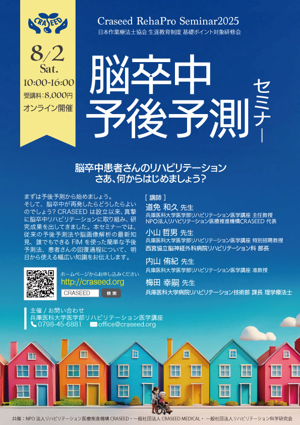 【日 時】 評価編:2026年2月21日(土)9:30~16:00実践編:2026年2月22日(日)10:00~16:00 【受講料】 各日15,000円 両日受講27,000円 【会 場】兵庫医科大学 【定 員】80名(定員になり次第、締め切りとなります) ※一般社団法人日本作業療法士協会の生涯教育制度 基礎ポイント対象研修会です。 詳細・お申し込み(共催:CRASEED HP)
